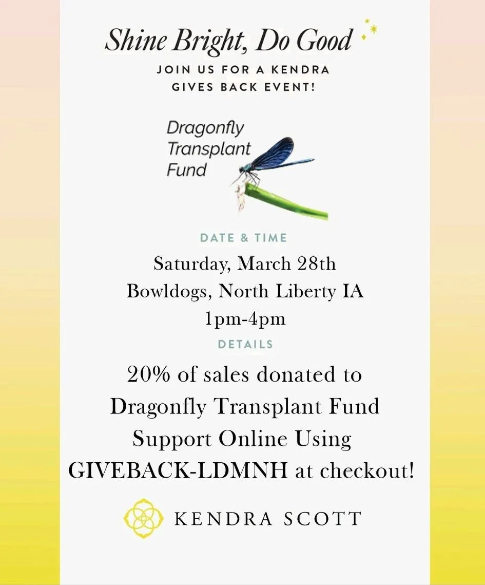 Our friends at Kendra Scott in Iowa City will host a special jewelry “Give Back” pop-up shop at BowlDogs during our celebration. 20% of all items shopped at the event and online 48 hours after the event will be donated to Dragonfly! Shop online at www.kendrascott.com and use code GIVEBACK-LDMNH at checkout.
